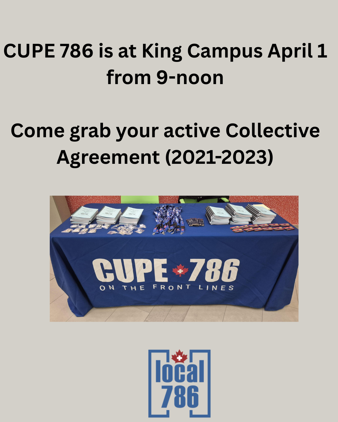 Hey King Campus! CUPE 786 will be on site Wednesday April 1 from 9am to noon. Come and grab your active Collective Agreement!