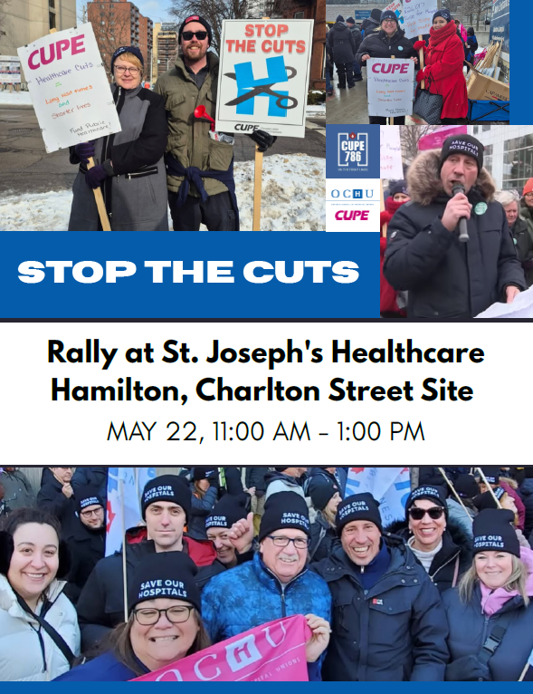 Attention CUPE 786 members and allies! Join us in solidarity on Wednesday, May 22 from 11:00 AM to 1:00 PM as we rally once again in front of St. Joseph's Healthcare Hamilton – Charlton Campus. We’re coming together to speak out against the ongoing cuts at St. Joe’s and to stand up [...]